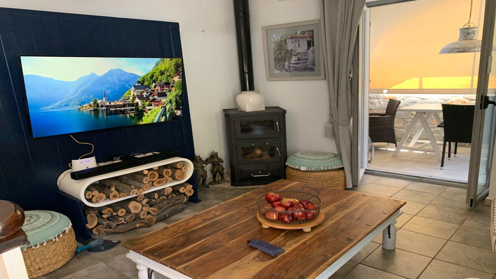 - Cozy lounge with two armchairs, a coffee table, TV, and a wood-burning stove (heats the entire house in winter)
